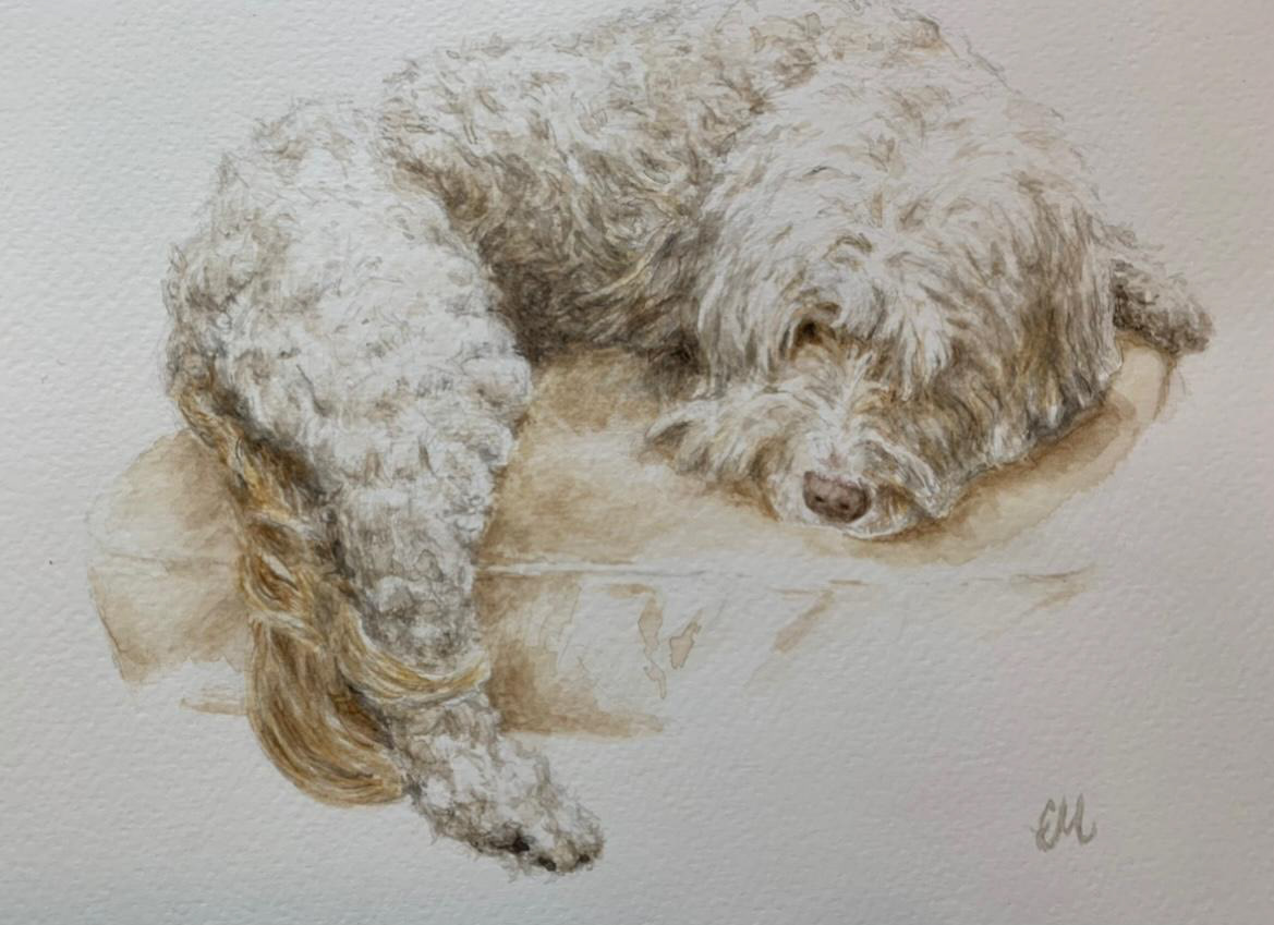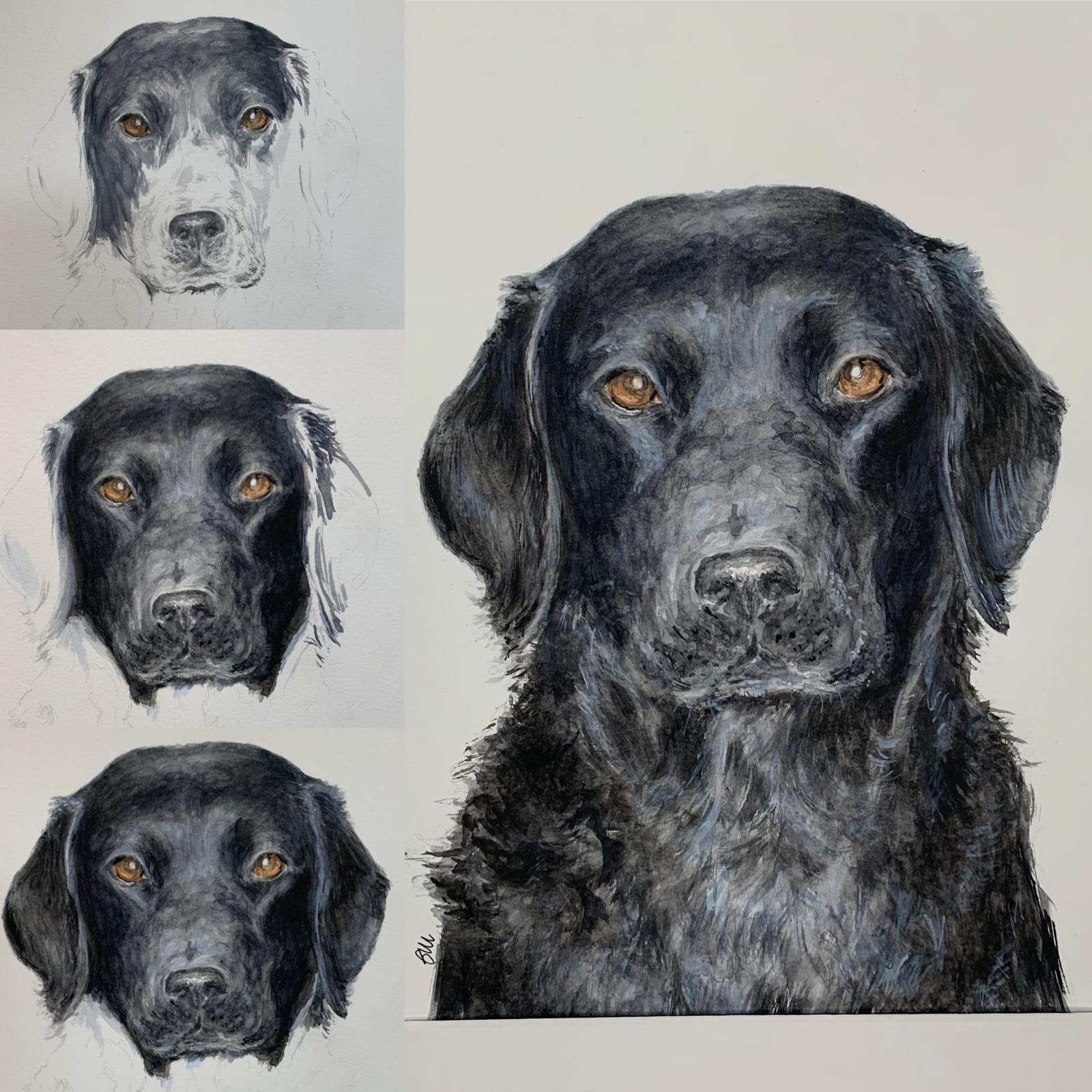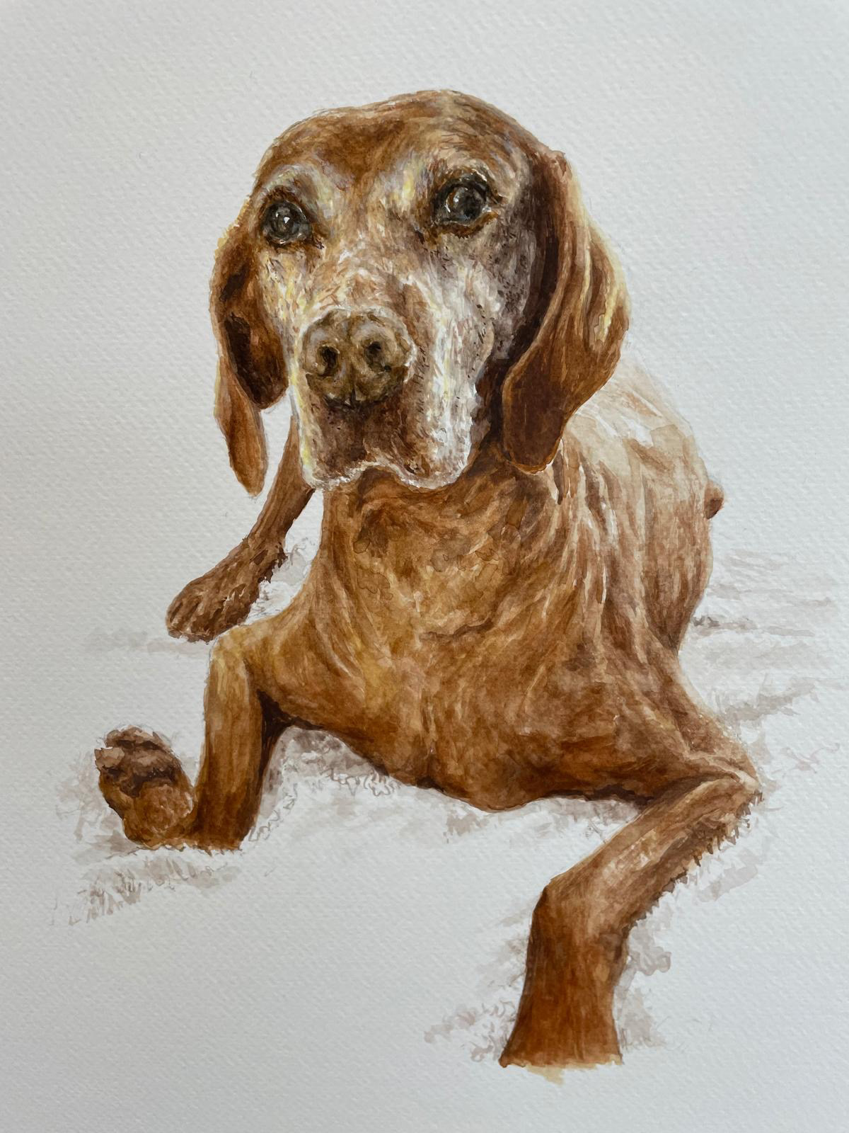 A typical pet portrait is worked in watercolour or pencil. I simply need a couple of good photographs to capture your pets' personality. I mount and frame an A4 painting into an A3 frame. A selection of coloured frames are available to choose. I charge between £95 and £120 for one pet and take around 5-9 working days to complete. Please message me if you have any further questions and to book in your personalised pet portrait.